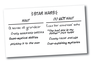 Everyone should write down one of each. It can be just about any trope you recognize from media—a genre, a character type, a setting element, or a plot device—as long as you can state it concisely and clearly (if you can’t, converse about it instead until you can).